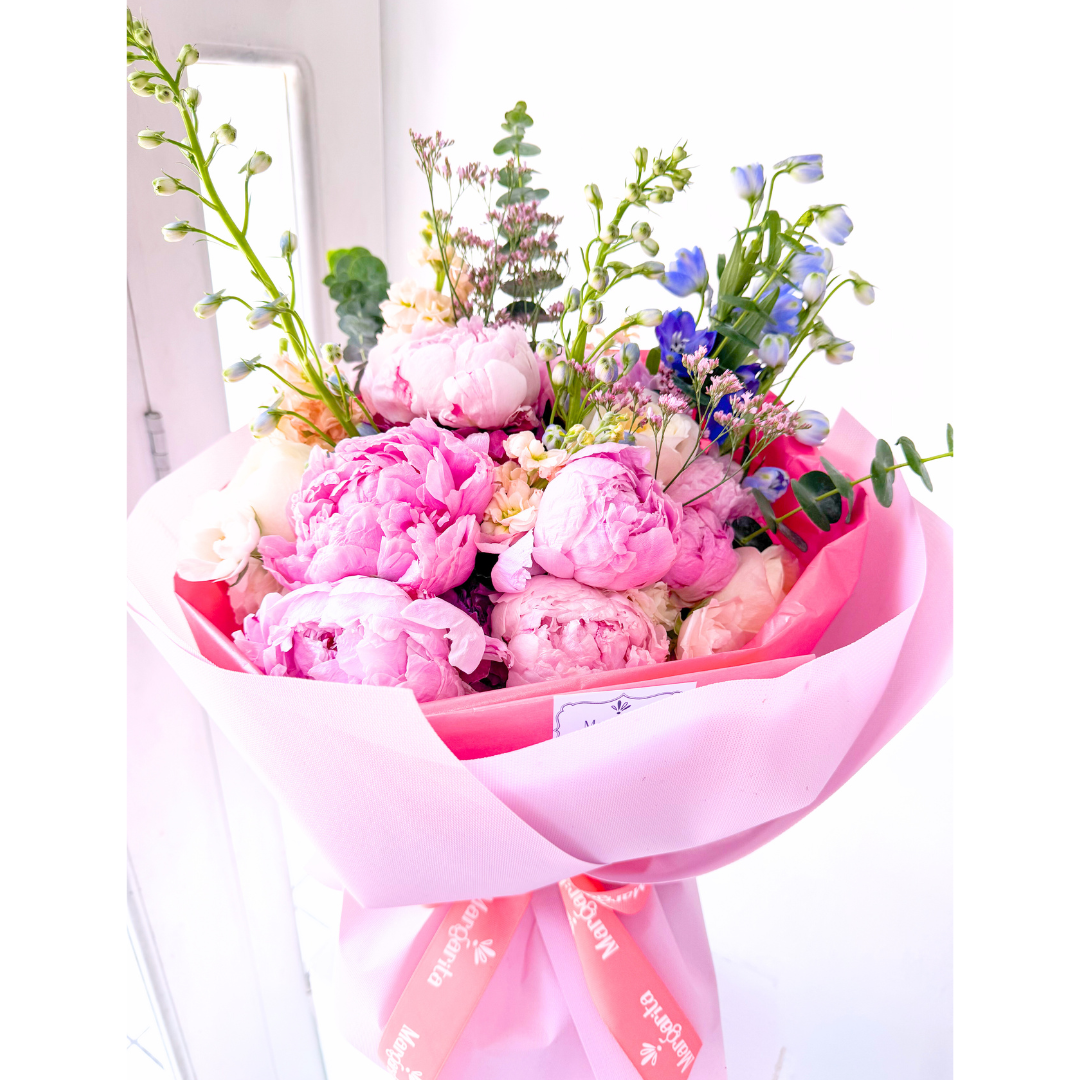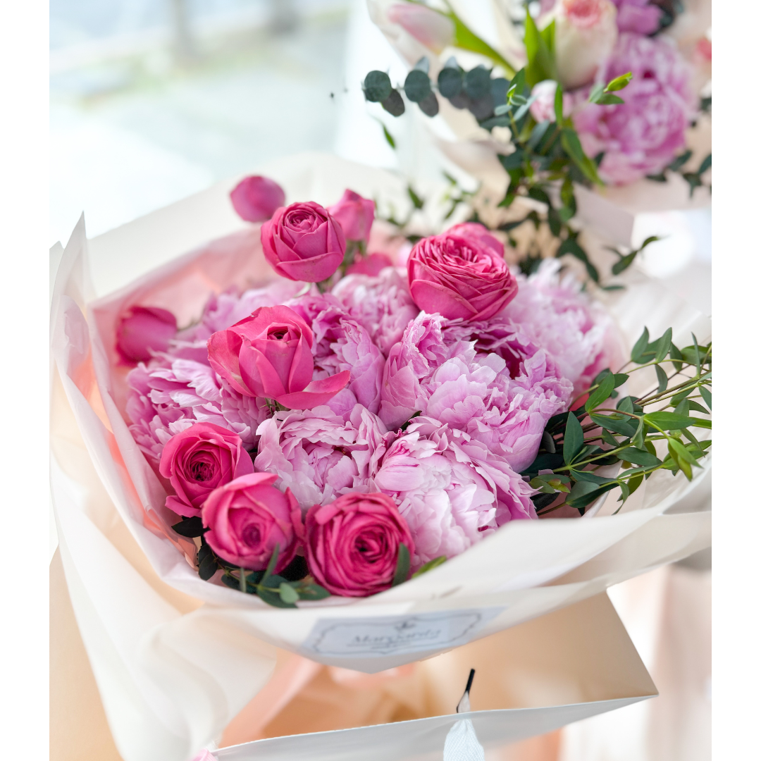 Consiente con un ramo de 10 Peonias importadas + hortensias + baby rosa. Empaque estilo Ruso en su flower bag y tarjeta, como lo muestra la imagen