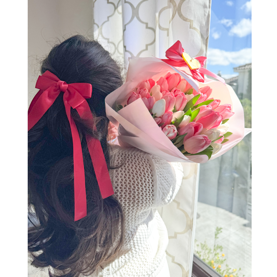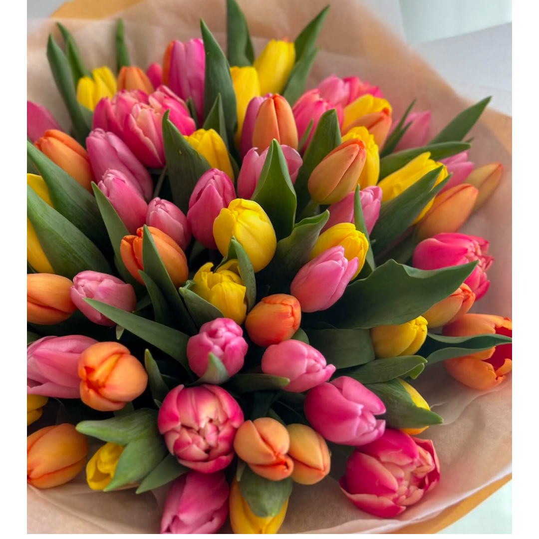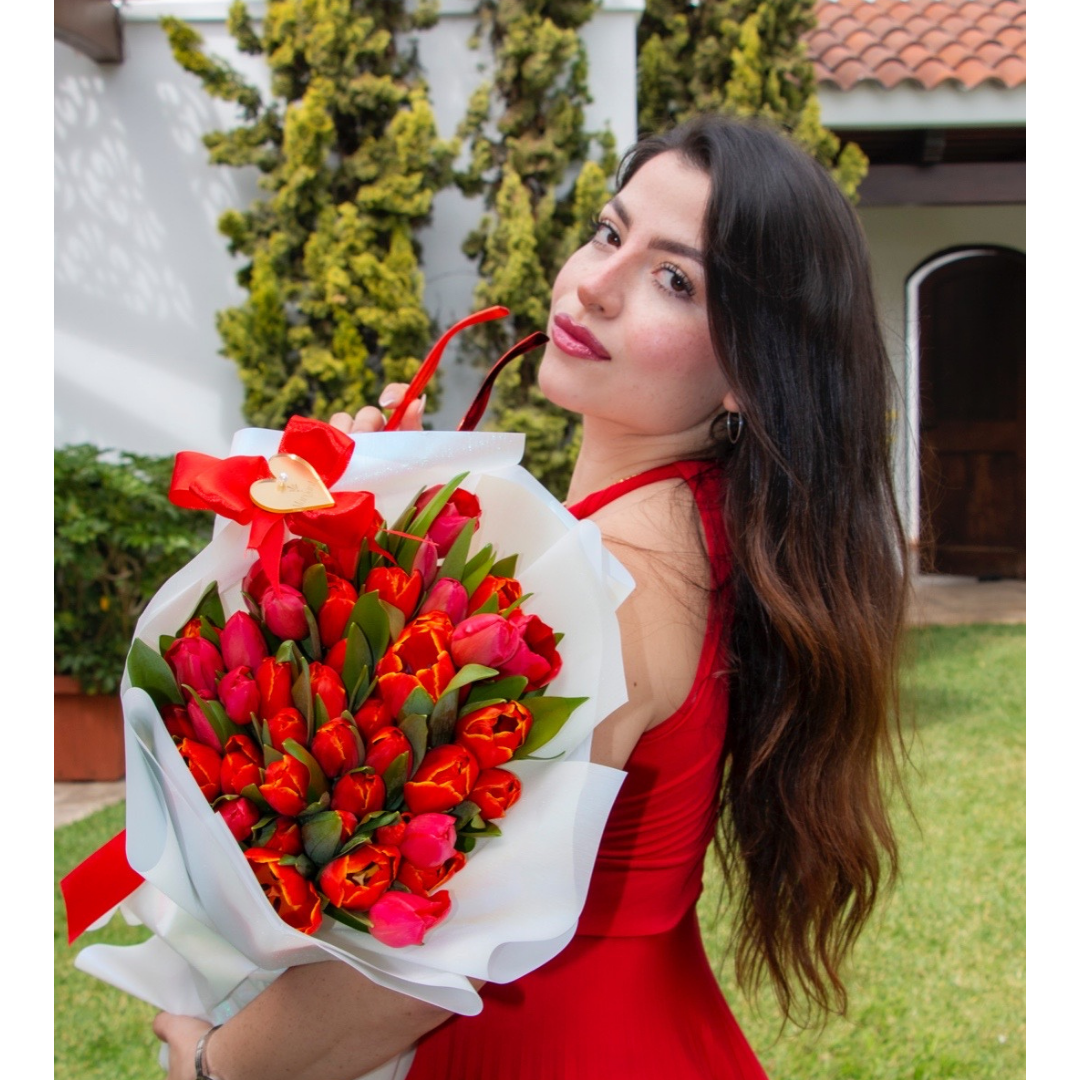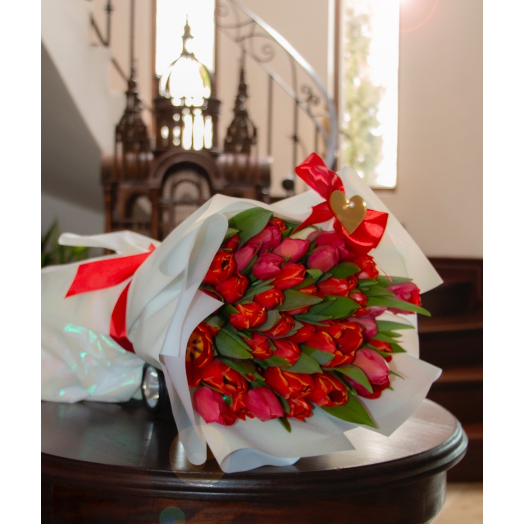 Ramo de 50 tulipanes de colores a tu selección y disponibilidad, empaque especial, en flower bag moña y tarjeta.