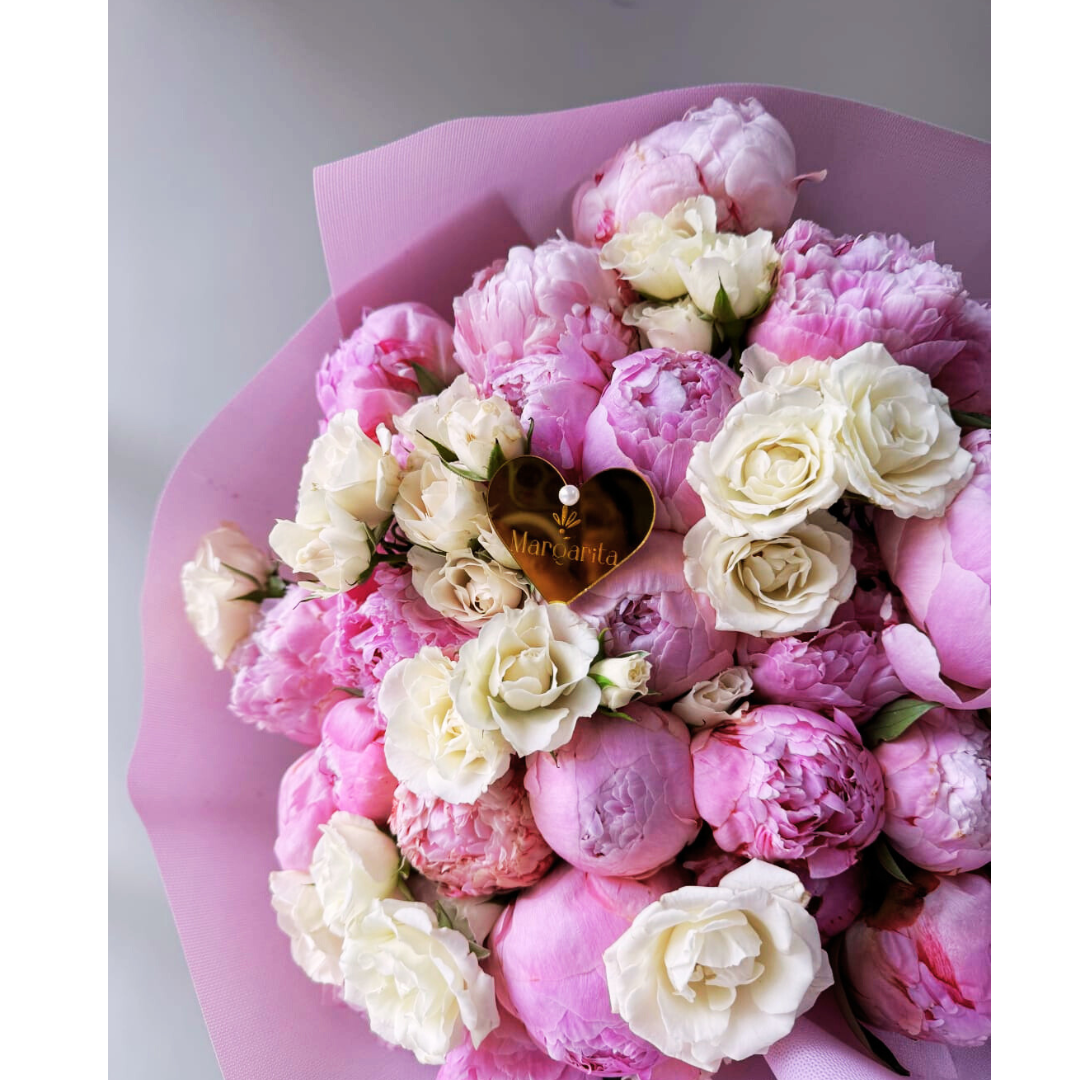 Deja plasmado este recuerdo, el día que regalaste un ramo espectacular de 30 Peonias con algunos detalles de baby rosa, empaque especial, moña y tarjeta.